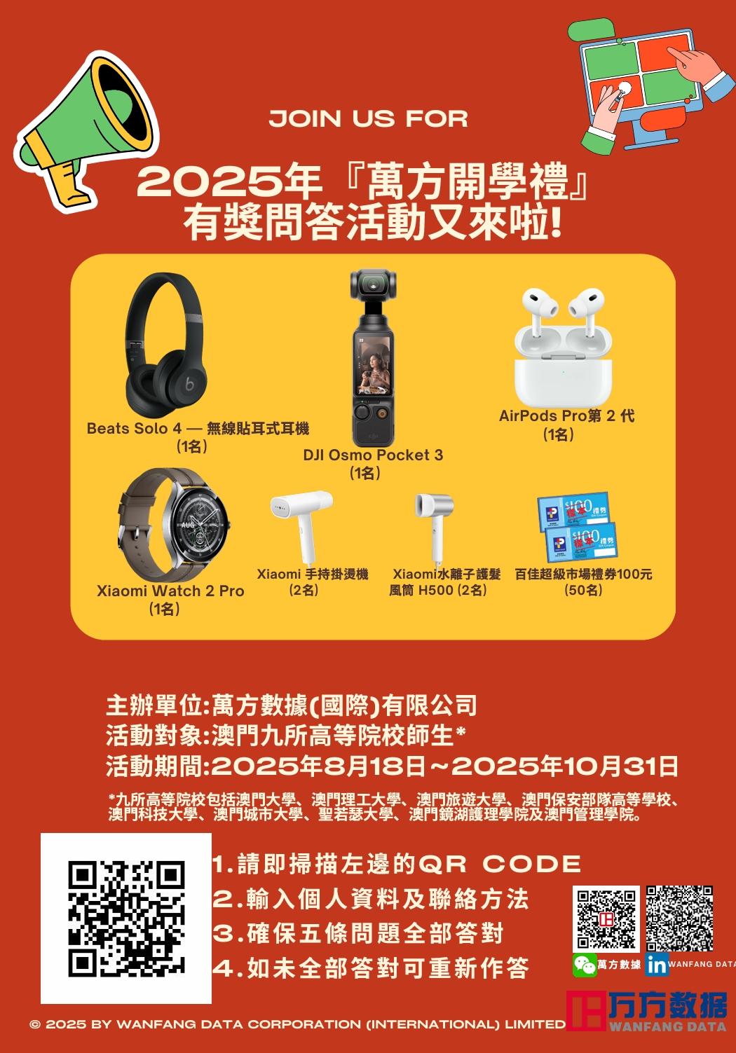 本次活動由萬方數據(國際)有限公司主辦,面向澳門九所高等院校的師生。活動期間為2025年8月18日至2025年10月31日。